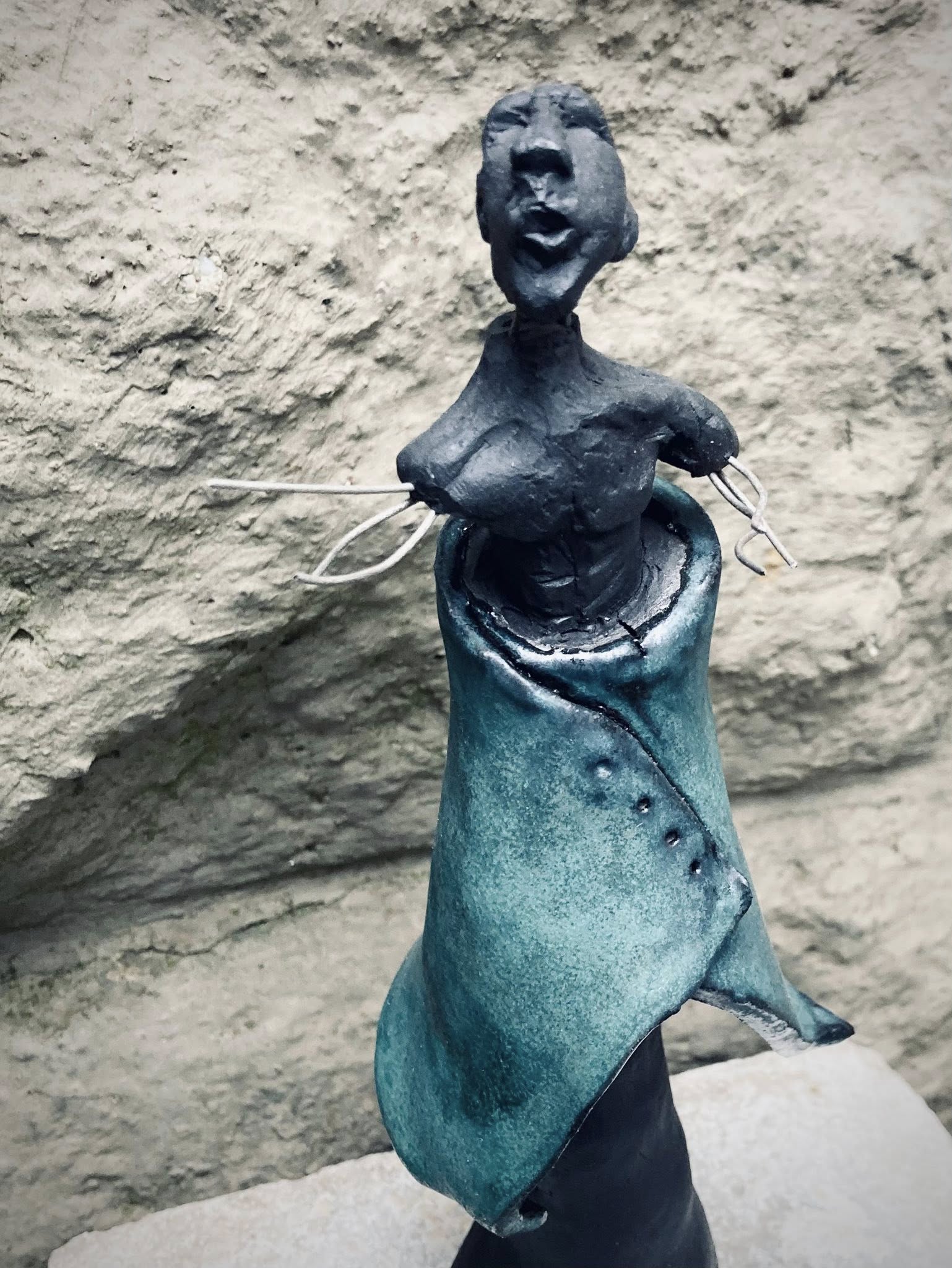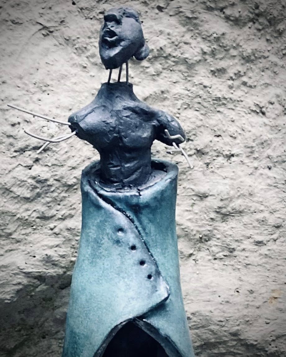 A pionír egy előfutár. Egy ősi test, aki egyensúlyoz a régmúlt és a jövő határán, elmozdulásra kész, mégis szilárdan áll. Teste absztrakt, széttartó formákból épül fel, arca elmosódott, mintha idő és személyiség nélküli lenne – archetipikus alak. A mázas felületeken finoman visszatükröződő türkiz zöld tónusok és a kézzel formált, szinte repedező test ellentétet képeznek: törékenység és kitartás egyszerre jelenik meg benne.